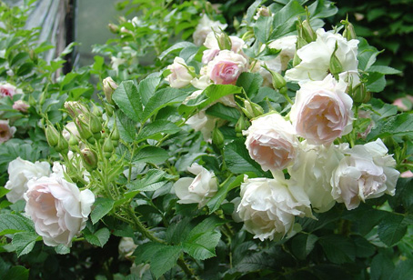 Высокий, раскидистый куст. Листва светло-зеленая, блестящая, морщинистая. Цветки нежно-розовые, полумахровые, из 17-25 лепестков, чашевидные, в соцветиях, в полном роспуске показывают серединку. Аромат сильный. Зимостойкость отличная